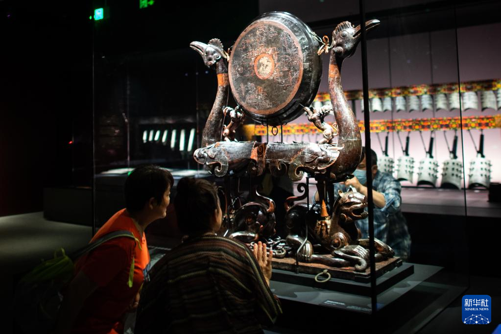 5月12日,参观者观看展出的彩绘漆木虎座鸟架鼓。