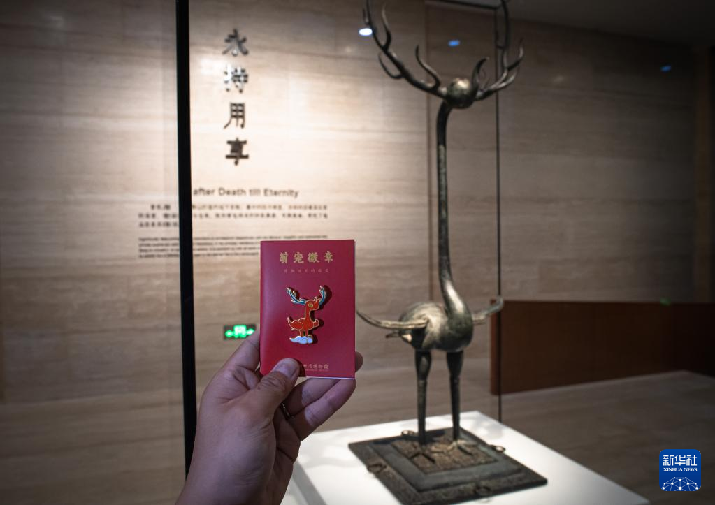 5月12日拍摄的铜鹿角立鹤文创徽章。