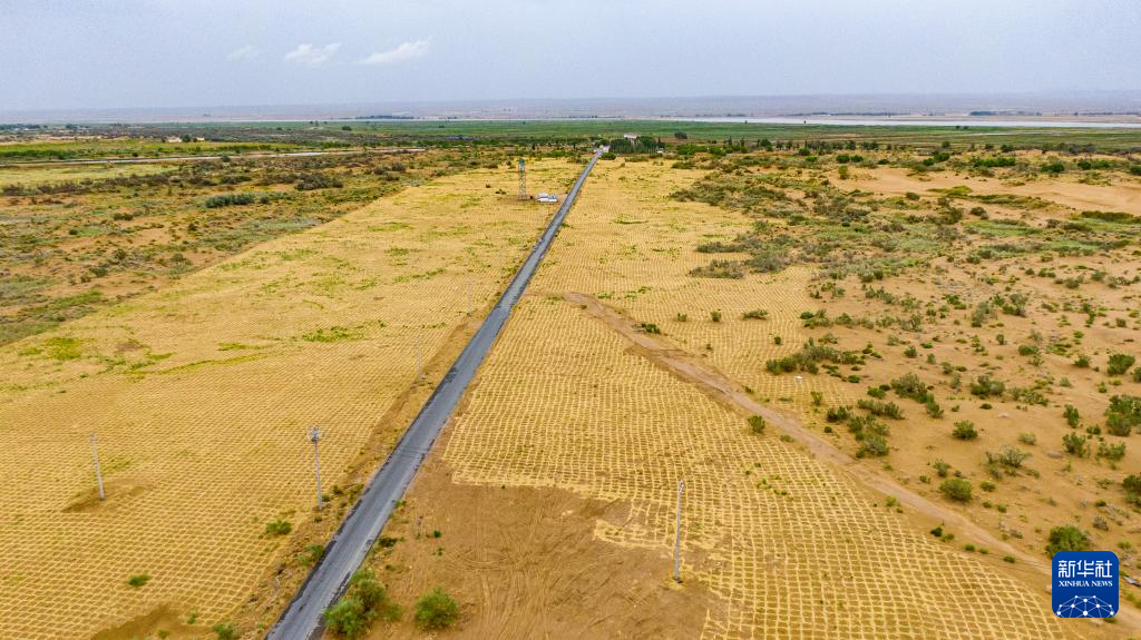 这是6月18日拍摄的巴彦淖尔市磴口县境内乌兰布和沙漠中的草方格(无人机照片)。