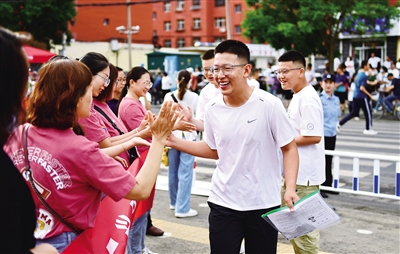 6月25日,在呼和浩特市中考第六中学考点,送考教师和考生击掌加油。当日,2023年呼和浩特市中考拉开帷幕,全市共有 29644 人报考(其中市四区23178人),设有33个考点、970个考场。初二年级结业考试报名人数为29838人,共设34个考点、1002个考场。6月25日起,我区各盟市中考陆续开启。记者 王磊摄