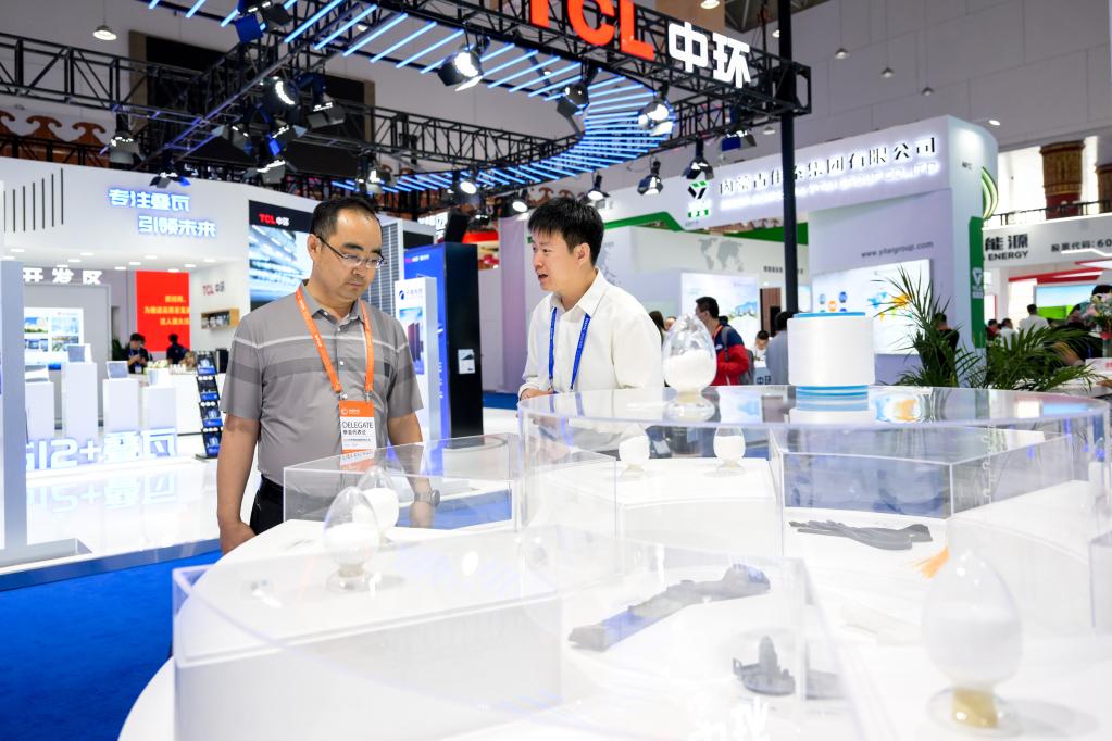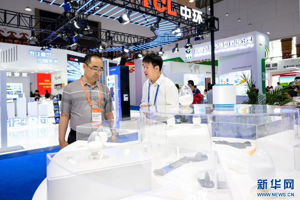 6月28日,参会人员在2023世界新能源新材料大会展览区参观。