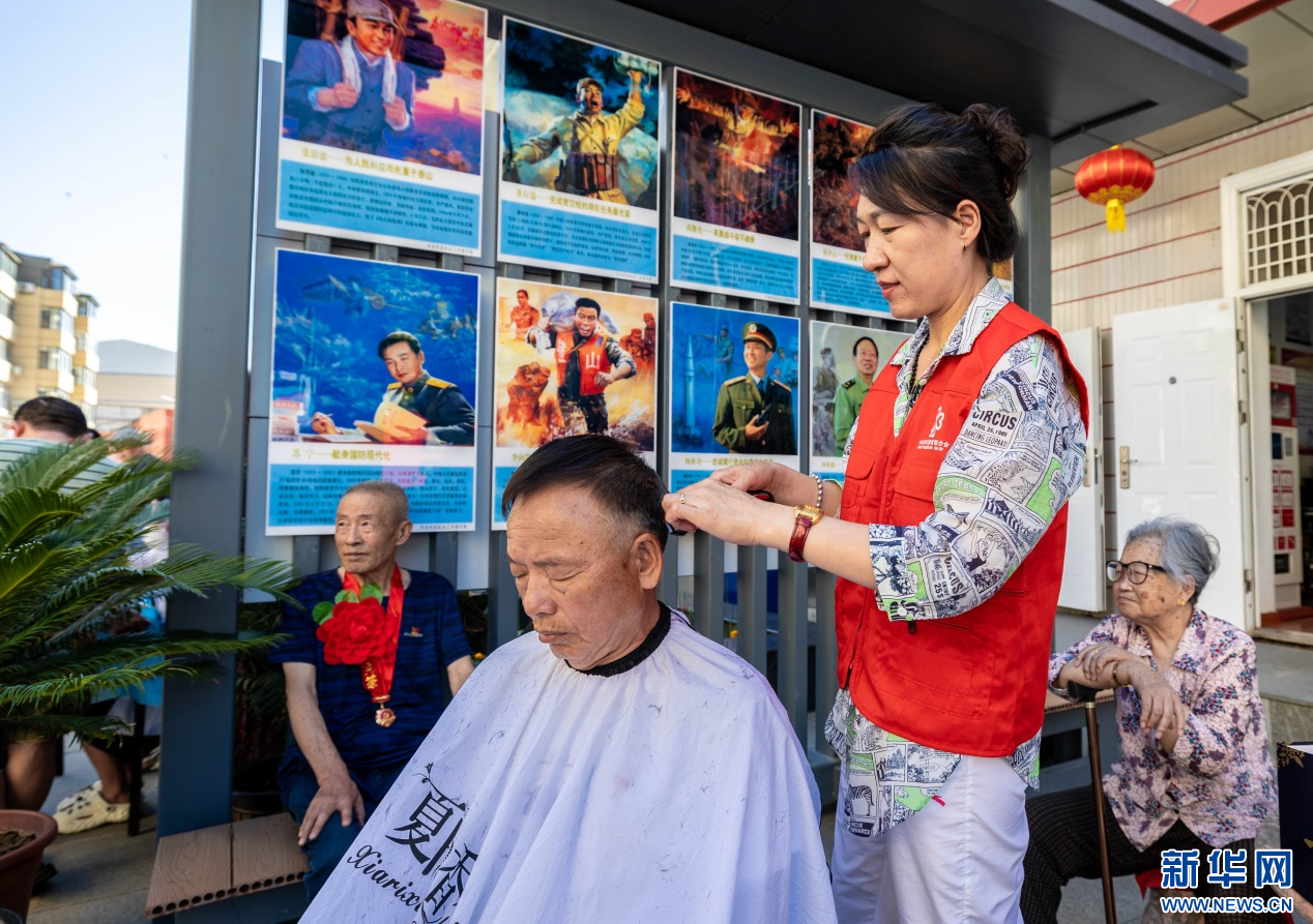 6月29日,志愿者在呼和浩特市玉泉区“同心向党庆七一,不忘初心颂党恩”主题活动中为群众免费理发。新华网发(丁根厚 摄)
