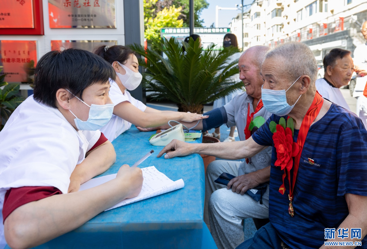 6月29日,医务志愿者在呼和浩特市玉泉区“同心向党庆七一,不忘初心颂党恩”主题活动中为老党员义诊。新华网发(丁根厚 摄)