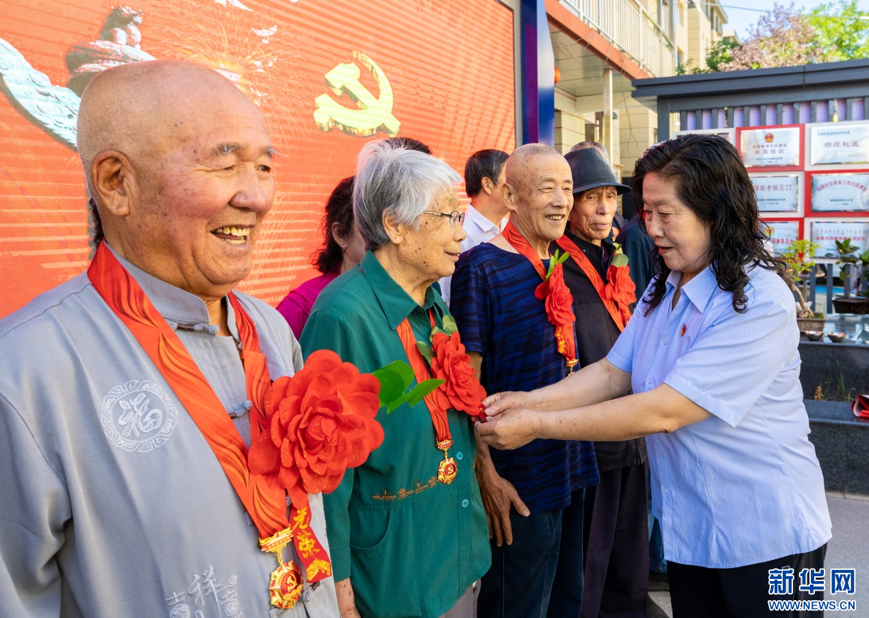 6月29日,呼和浩特市玉泉区清泉街社区的相关负责人为老党员颁发“光荣在党50年”纪念章。新华网发(丁根厚 摄)