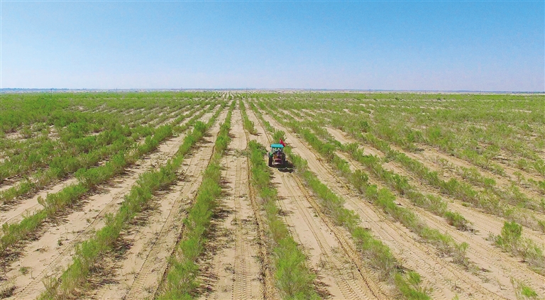 巴彦淖尔市磴口县,工作人员驾驶大型机械在乌兰布和沙漠梭梭林中接种苁蓉。王治贵 摄