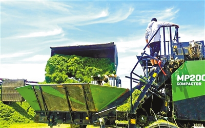 这段时间,呼和浩特市土默特左旗种植的近2.75万亩优质苜蓿喜获丰收。在土默特左旗国家现代农业示范区苜蓿种植基地内,3200亩优质紫花苜蓿郁郁葱葱,一台台收割机穿梭其中收割作业。这些苜蓿经粉碎、晾晒、聚拢、打捆成“草罐头”,将成为伊利牧场牛羊的最佳青饲料。