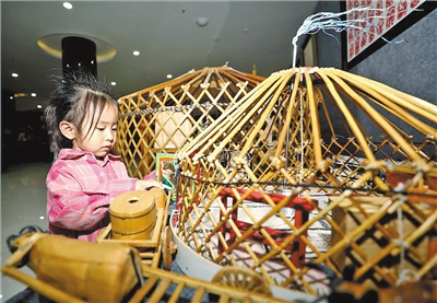 小朋友在手工制作的“蒙古包”模型跟前玩耍。