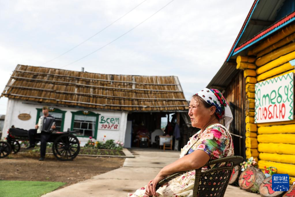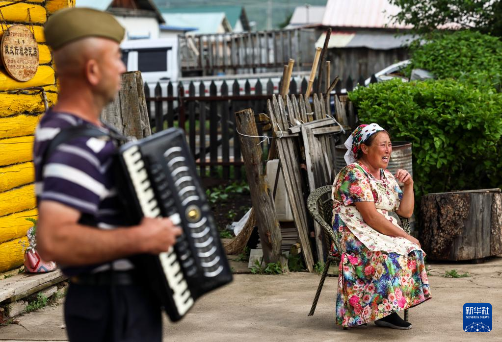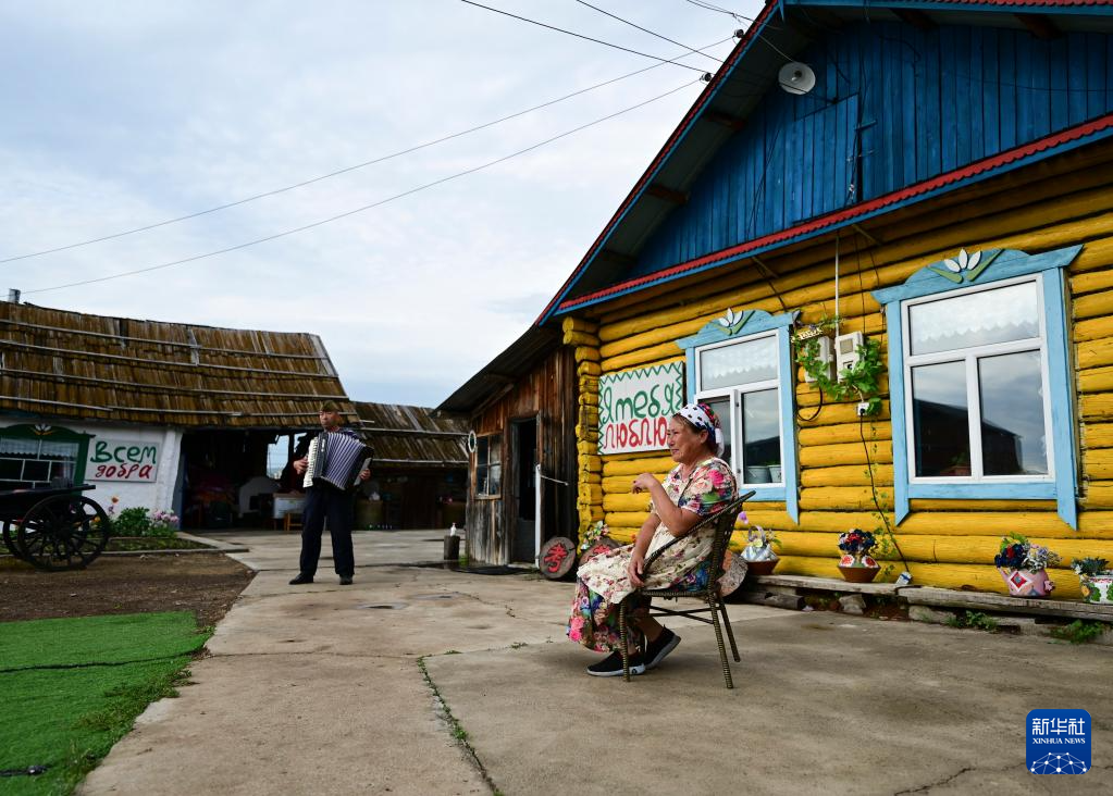 6月28日,考占花(左)为游客们唱歌,萨沙在拉手风琴。考占花是萨沙的嫂子。