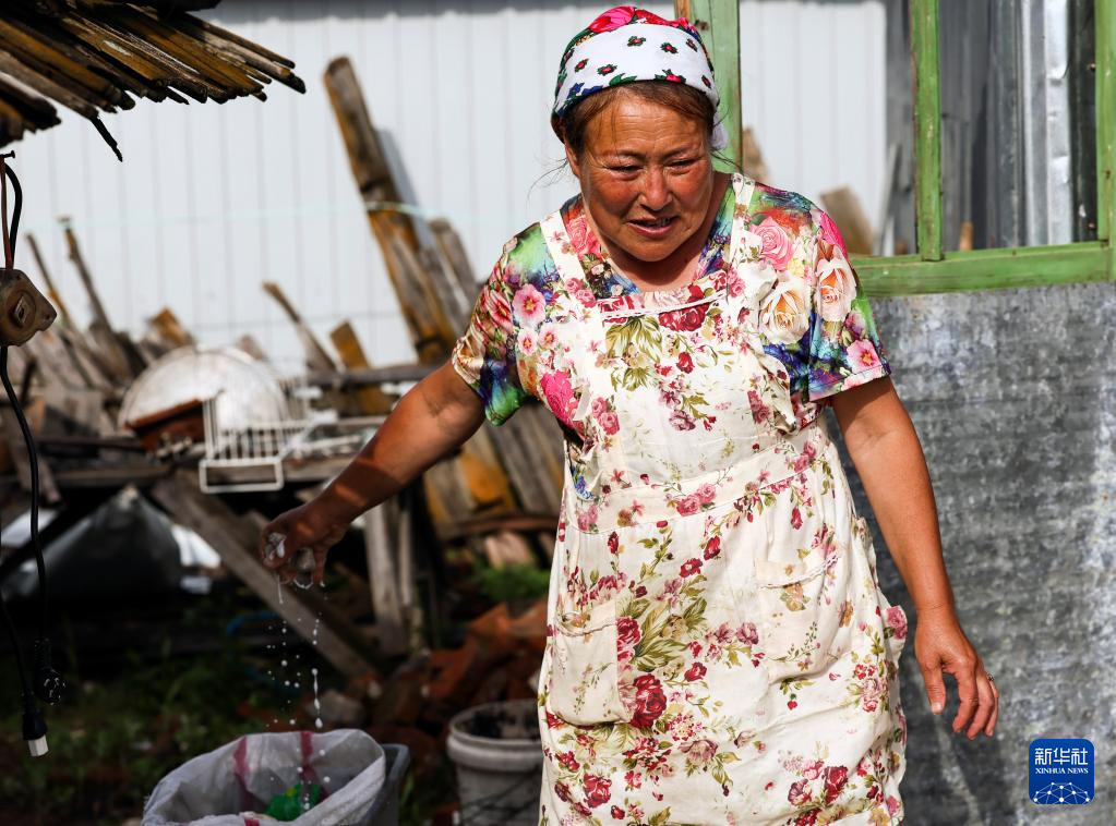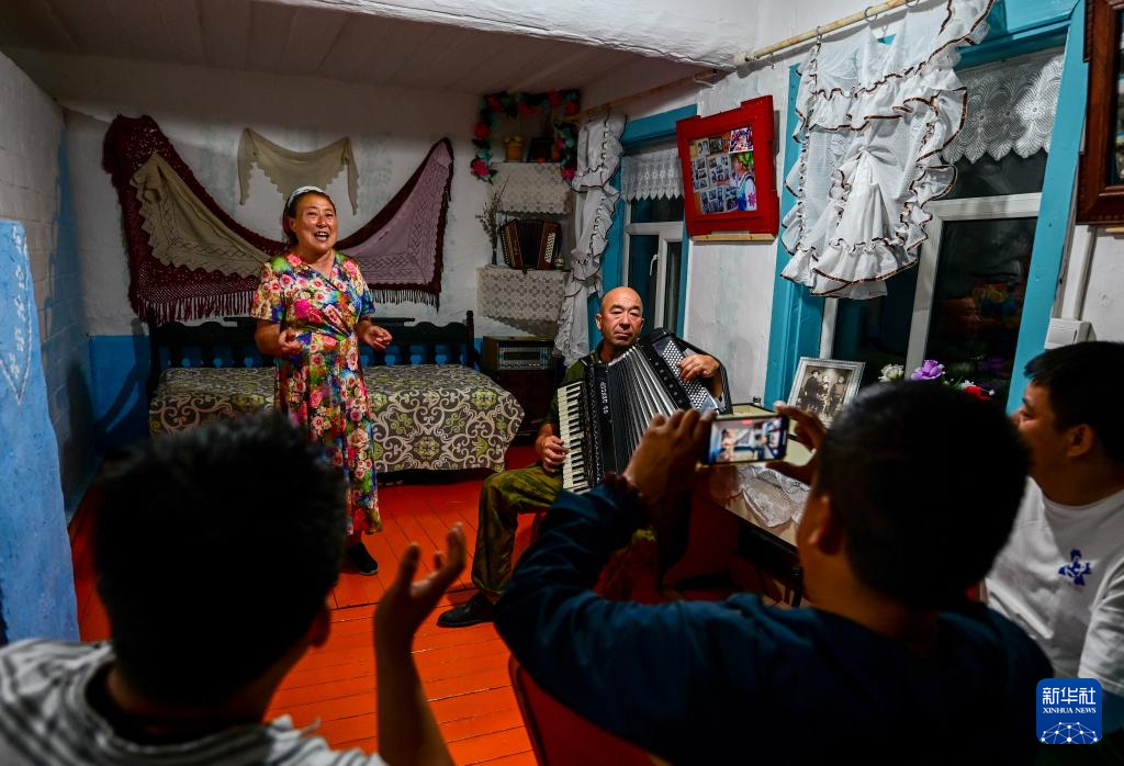 6月28日,考占花(右)坐在院子里唱起俄罗斯族歌曲。