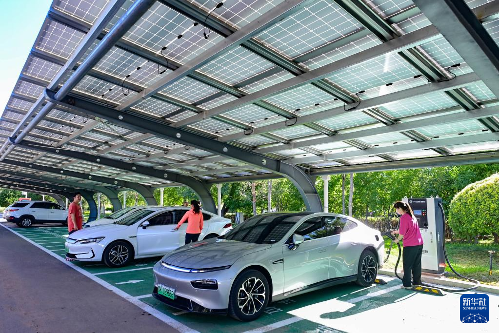7月8日,市民在鄂尔多斯市康巴什区公共停车场里为电动车充电。该停车场建设了棚顶光伏发电设施。