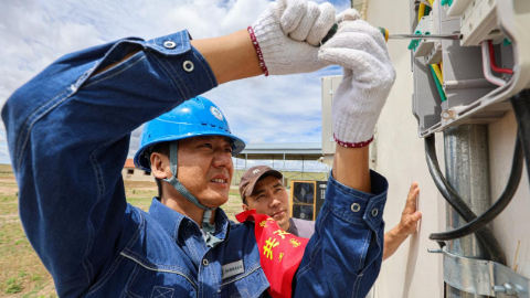 电力工作人员为敖木希勒家检查用电情况。