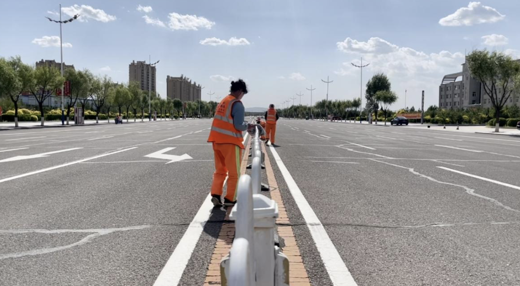 高温下,环卫工人们在擦拭护栏。郭慧敏 摄