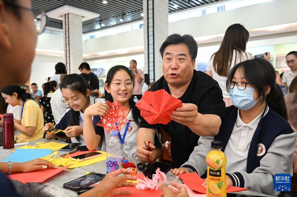 7月30日,剪纸艺术家段建珺(右二)在活动中向呼和浩特市第二中学学生介绍剪纸技艺。
