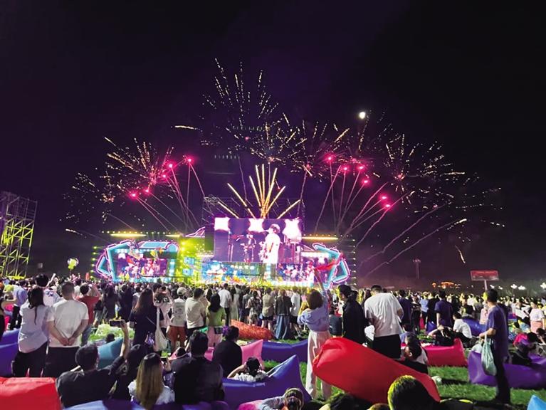 夜幕降临,赵雷、二手玫瑰等深受乐迷喜爱的明星音乐人演唱了一首首经典代表作,点燃全场观众的热情,数万乐迷跟着音乐舞动,绚烂烟花照亮天空,将演出推向高潮。
