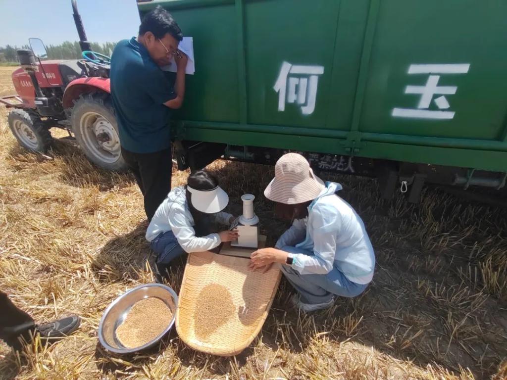 工作人员对临河区狼山镇光明村麦田测产。新华社记者李云平 摄