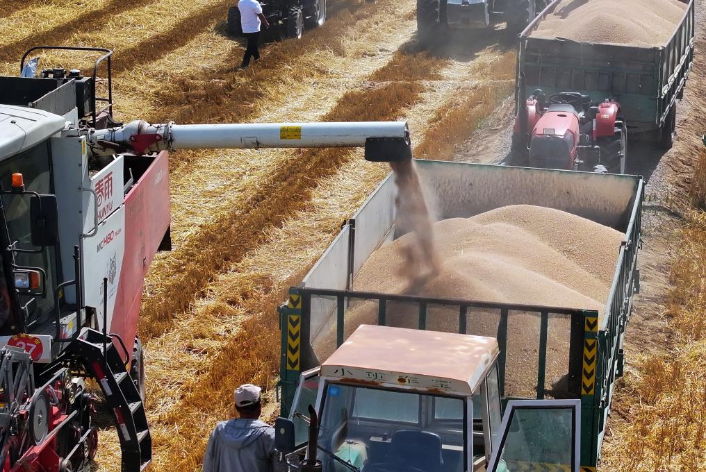 临河区狼山镇光明村农户收获小麦。新华社记者李云平 摄