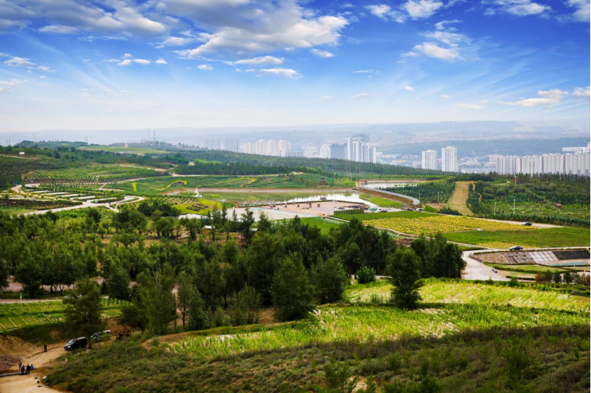 站在哈拉沟生态示范基地的观景台上放眼望去,山、水、林、田、湖、草、沙,构成了一幅美丽动人的绿色画卷。