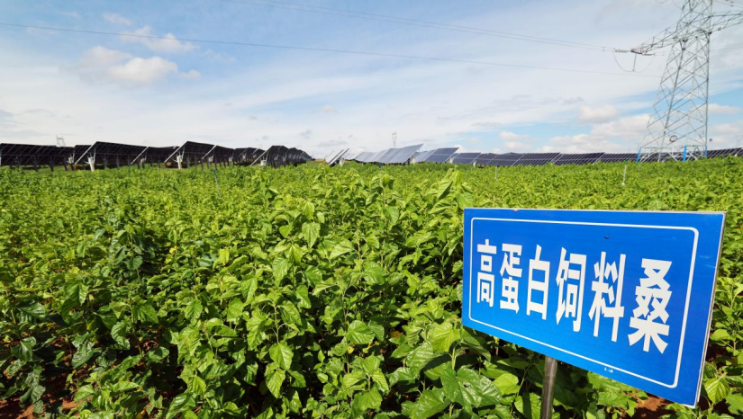 微风轻拂,行走在神东煤炭集团布尔台生态示范基地,首先映入眼帘的是一排排光伏板组成的“光伏海洋”,光伏板下,高蛋白饲料桑、苜蓿等饲草绿意盎然,一派生机勃勃的景象。