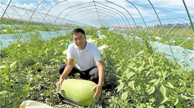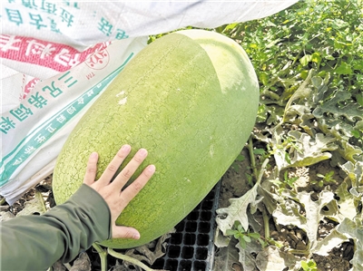 在瓜棚里,一颗颗硕大的西瓜正在遮阳板下“乘凉”。“这种巨型西瓜叫‘大漠农人’,属少籽大果高产型西瓜,生长周期为125天,最大的西瓜已经达到120多斤,直径超过50厘米。目前,大部分西瓜已经被预订,每亩地预计纯利润达到3万元。”杨存辉介绍。
