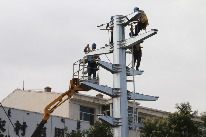“咚,咚,咚”,随着一声声巨响,高10米的钢管塔预制桩被打桩机结实的嵌入地底。“隆、隆、隆”,伴着大型吊车滑轮的转动,13米的钢管塔稳稳和预制桩连接到一起。施工人员迅速用连接螺栓固定,一基崭新钢管塔就组立完成了。更换过程中,因担心钢管塔预制桩在放入时挂断周边旧线路,影响居民后续的用电。电力施工人员利用绳索将线路拉至一侧,确保施工安全进行。