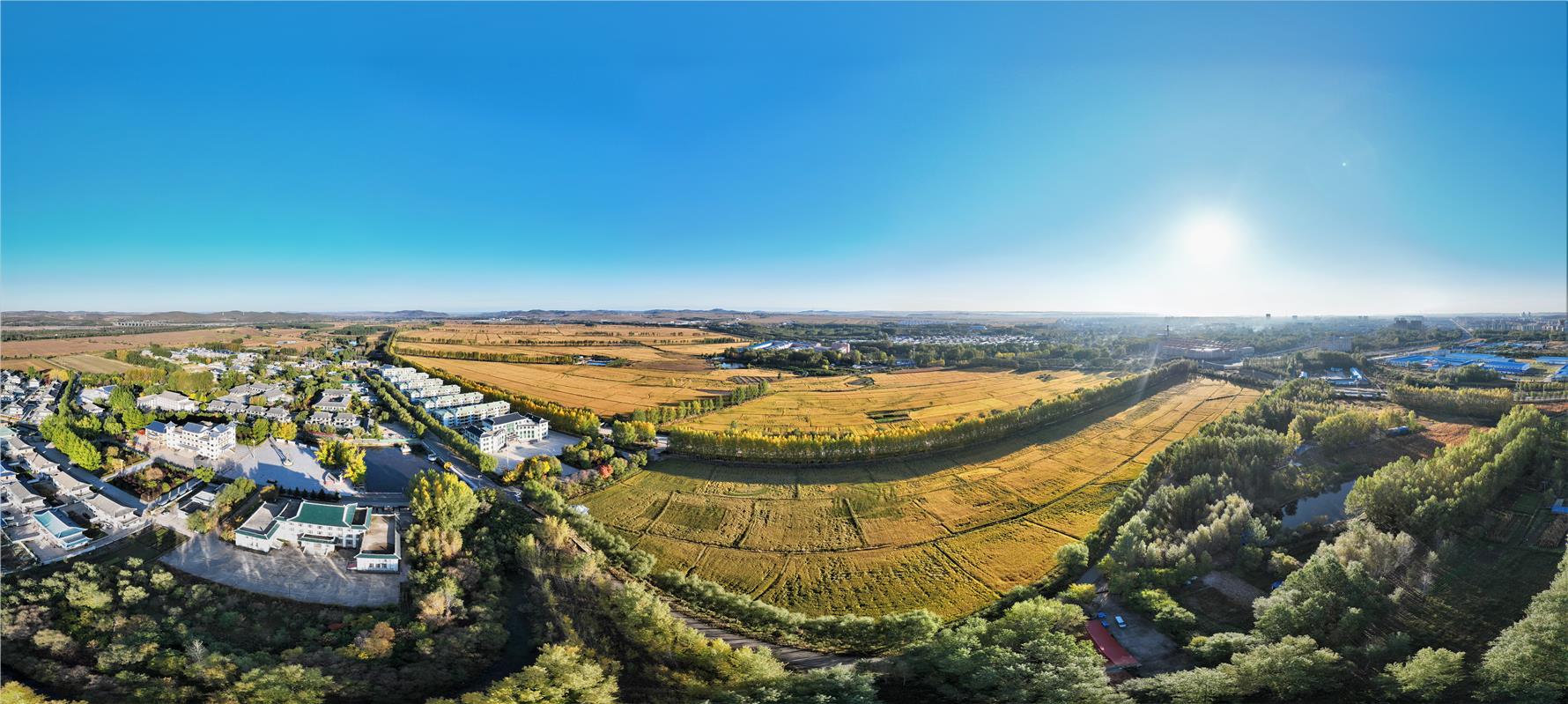 金秋十月,呼伦贝尔市唯一的朝鲜族乡——阿荣旗新发乡东光村高寒水稻种植基地,金灿灿的水稻田丰收在即,从空中俯瞰,一幅色彩斑斓、形象生动的稻田画如织锦般铺展开来。稻田画勾勒出朝鲜族象帽、长鼓的图案和“产业强乡,七彩东光”的文字,彰显民族特色。