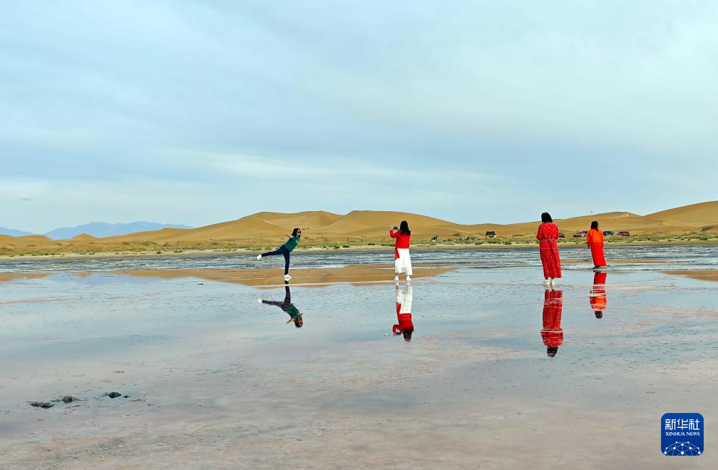 10月13日,游客在内蒙古阿拉善左旗腾格里沙漠中的乌兰湖拍照。新华社记者 贾立君 摄