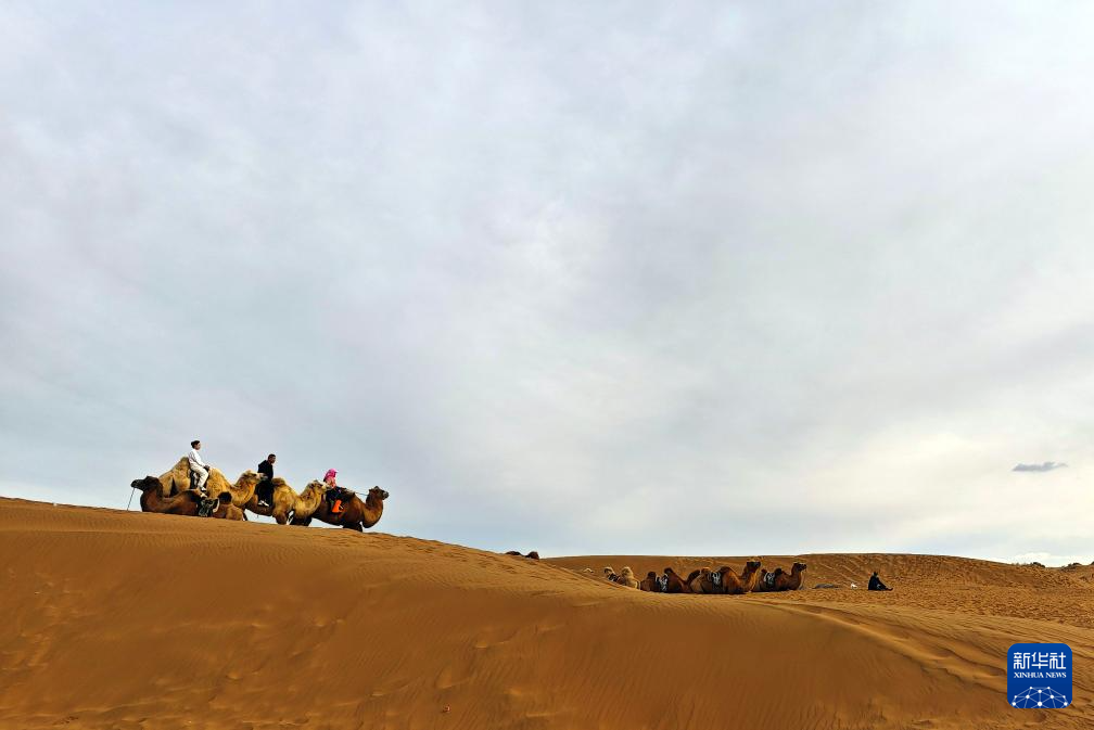 10月13日,游客在内蒙古阿拉善左旗腾格里沙漠中骑骆驼。新华社记者 贾立君 摄
