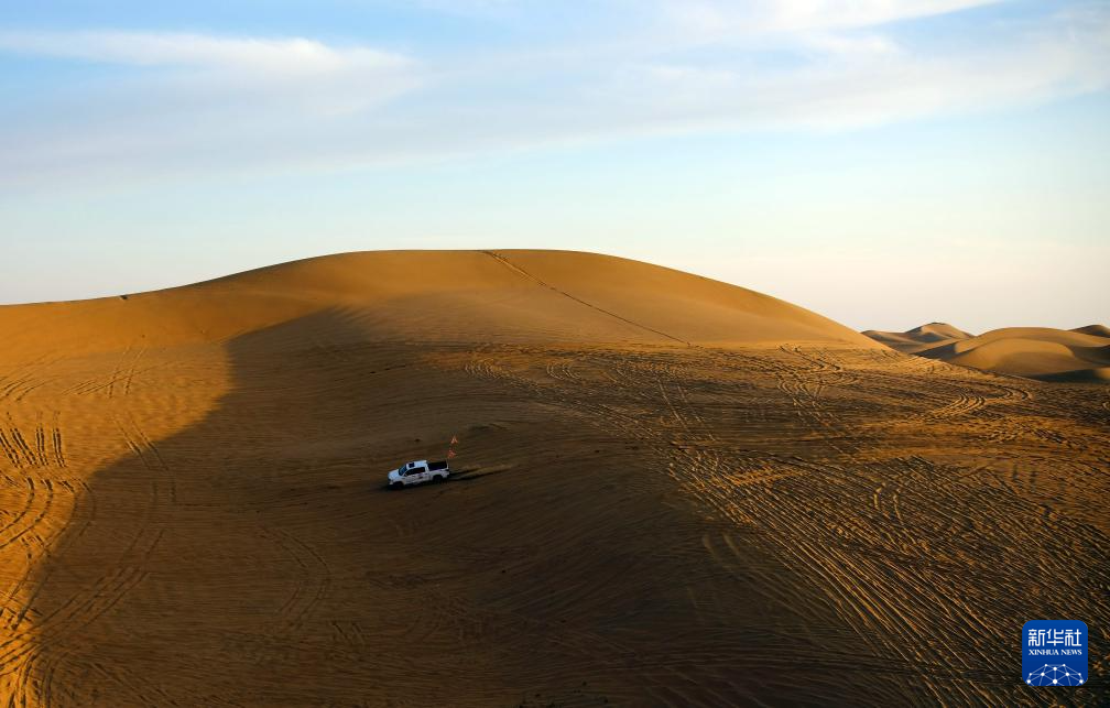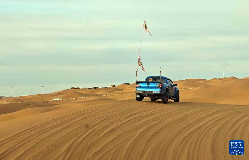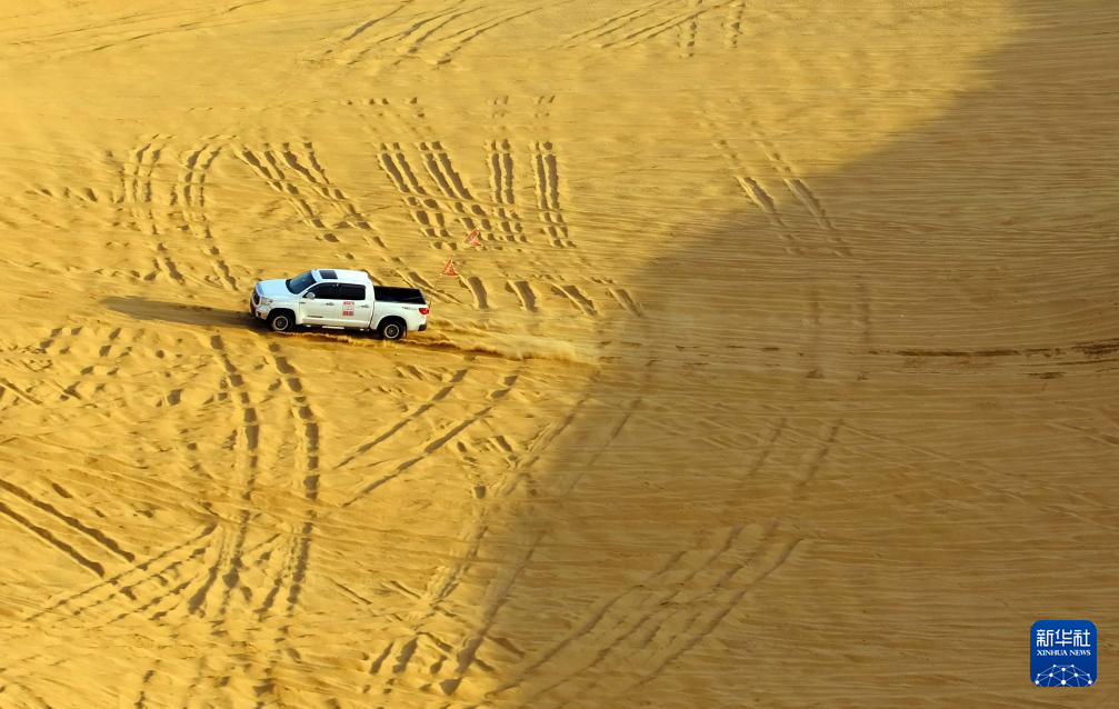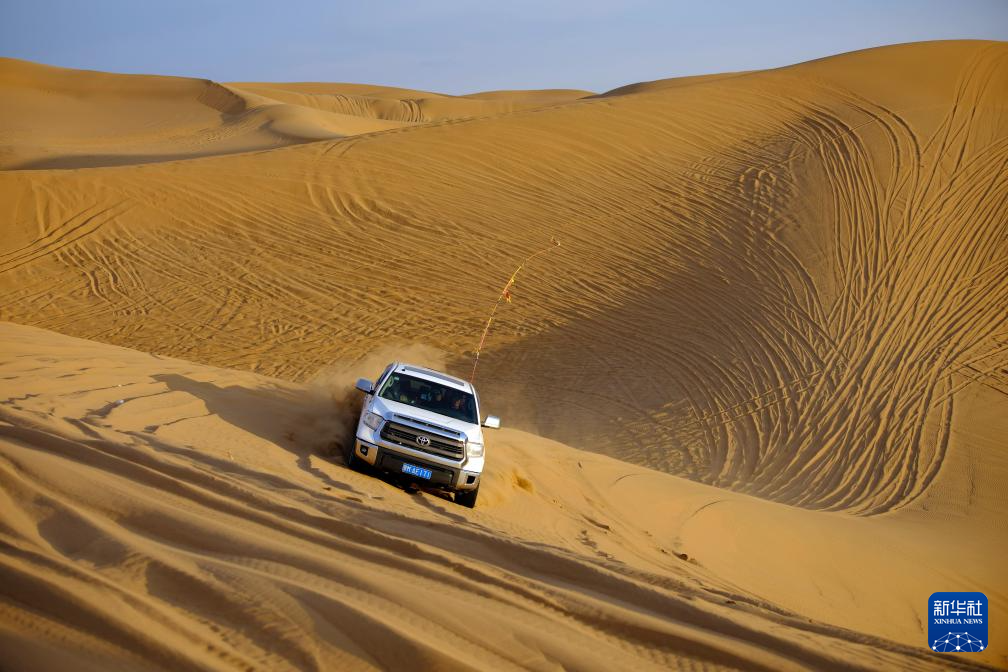 内蒙古阿拉善左旗腾格里沙漠中飞驰的越野车。新华社记者 贾立君 摄