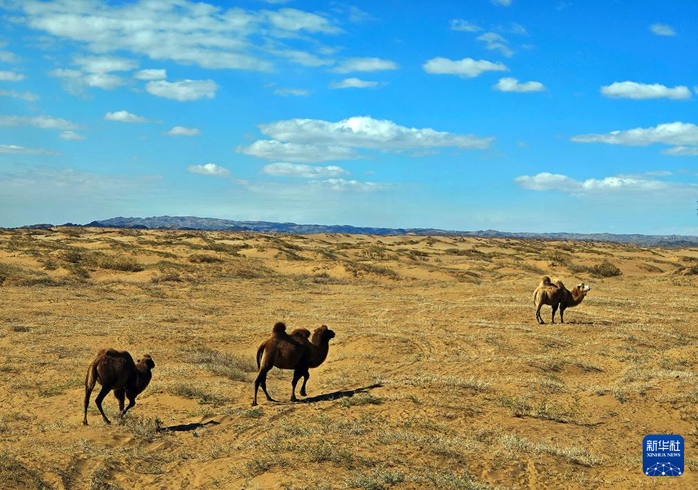 10月13日,几头骆驼在内蒙古阿拉善左旗腾格里沙漠中悠闲漫步。