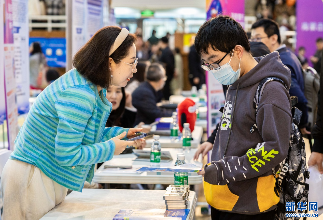 10月15日,求职者在内蒙古自治区校园招聘活动现场与招聘单位代表交流。新华网发(丁根厚 摄)