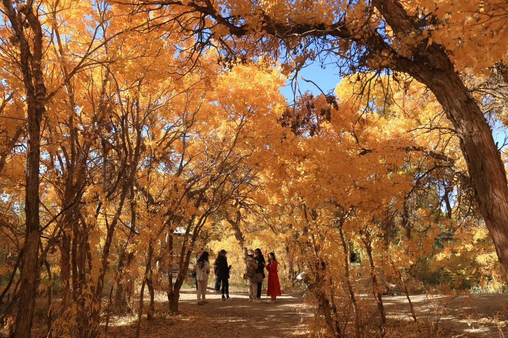 深秋时节,全国胡杨林分布最为集中的内蒙古额济纳胡杨林进入最佳观赏期,吸引游客前来欣赏“如花秋叶惹人怜”的美景,感受大漠深处最美秋色。
