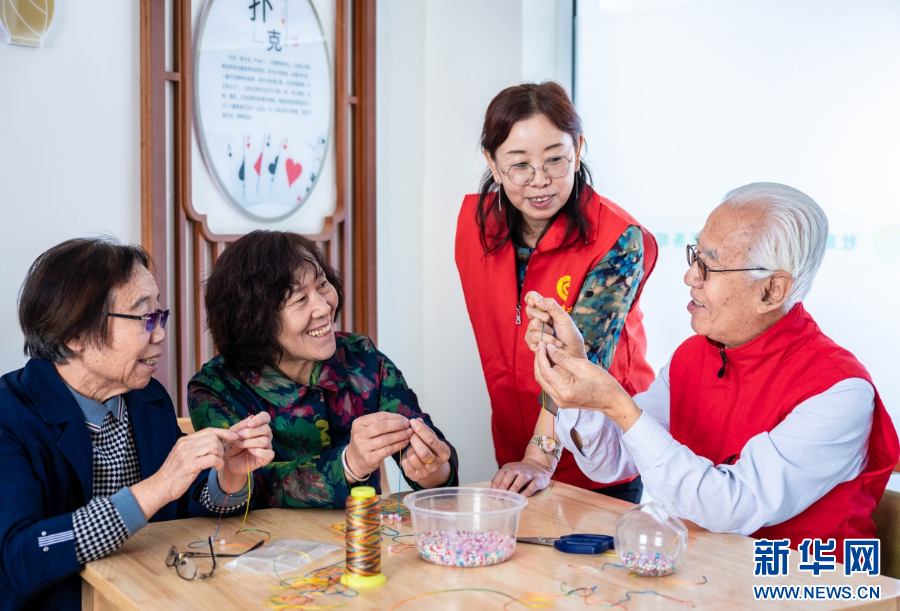 10月26日,呼和浩特市玉泉区石东路街道居家和社区养老服务综合体,志愿者陪伴老人们进行串珠手工艺制作。新华网发(丁根厚 摄)