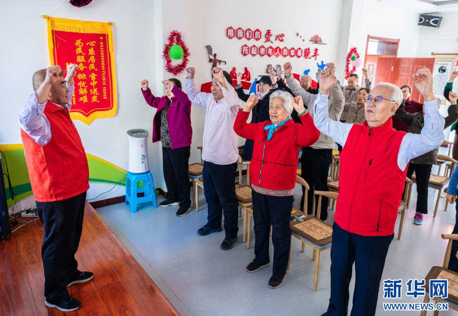 10月26日,志愿者陪伴老人们练习养生操。新华网发(丁根厚 摄)