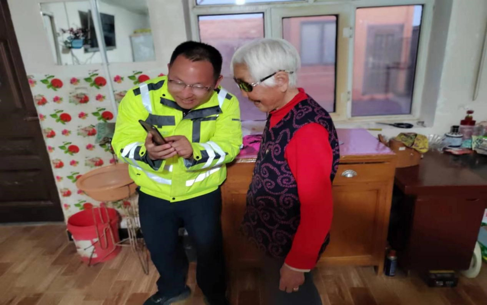 移动维护人员为尼玛老人测试手机通信信号质量。