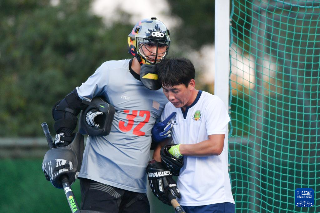 11月7日,内蒙古队守门员王才雨(左)与队友孟迪浩交流。