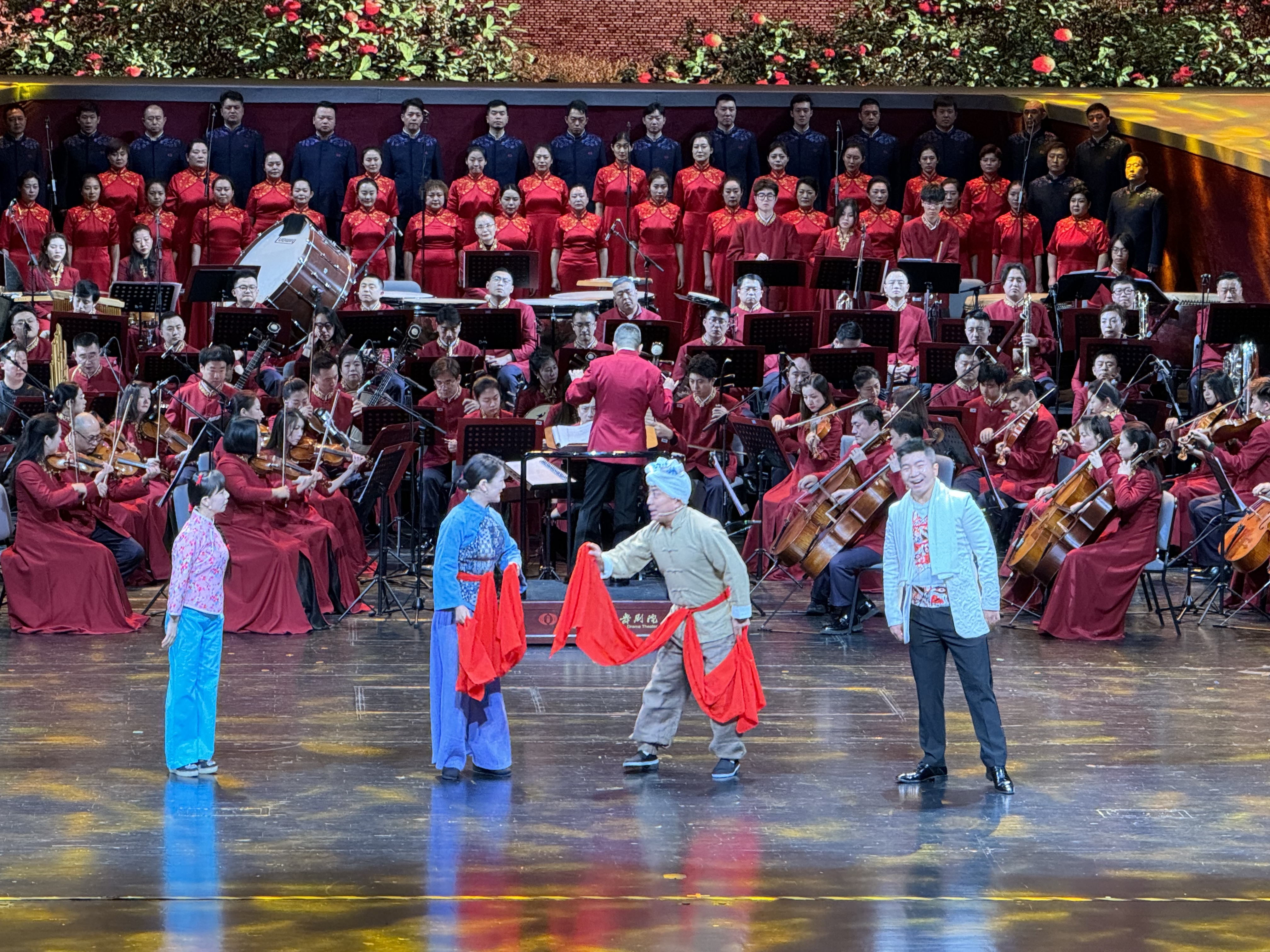 11月13日晚,内蒙古鄂尔多斯大剧院,演员们正在表演陕北秧歌剧《兄妹、夫妻新唱》。新华网发(刘瑞 摄)