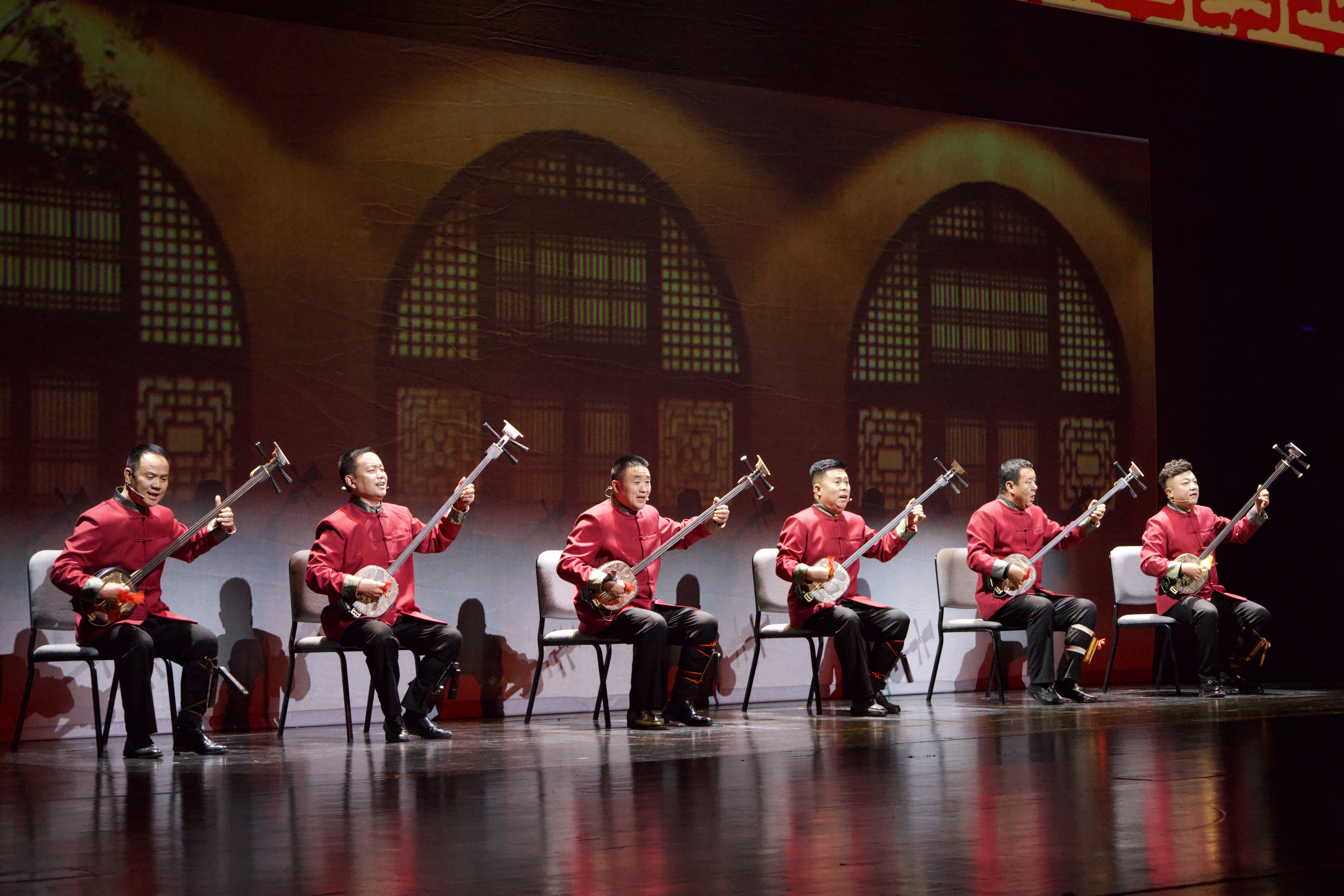 11月13日晚,“陕北民歌音乐会”全国巡演鄂尔多斯站演出现场,演员们正在表演陕北说书《刮大风》。新华网发(高宁 摄)