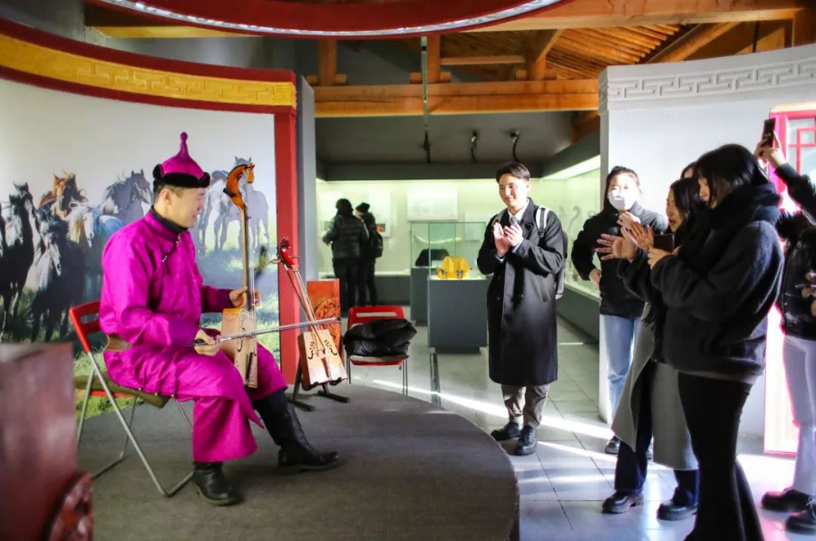 随后大家一起来到内蒙古马头琴艺术博物馆,馆中藏有马头琴、潮尔、冒顿潮尔、口弦琴等多种蒙古民族乐器,还存有诸多民族音乐学家的文献著作,现场有工作人员为大家进行马头琴演奏,期间还有留学生进行演奏技巧交流,音乐在不同文化间成了传递友好和文明的使者,收获了大家的阵阵掌声,研学过程充满欢声笑语又收获颇丰。