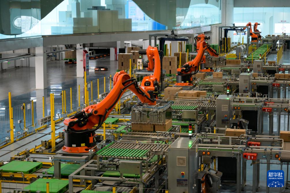 11月23日,在呼和浩特市伊利现代智慧健康谷液态奶全球智造标杆基地,机器人在码放装箱的乳制品。
