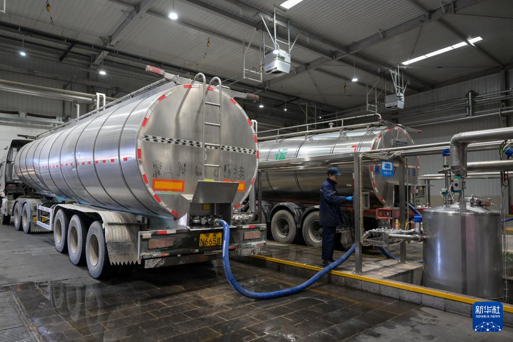 11月23日,在呼和浩特市伊利现代智慧健康谷液态奶全球智造标杆基地,工人在进行收奶作业。