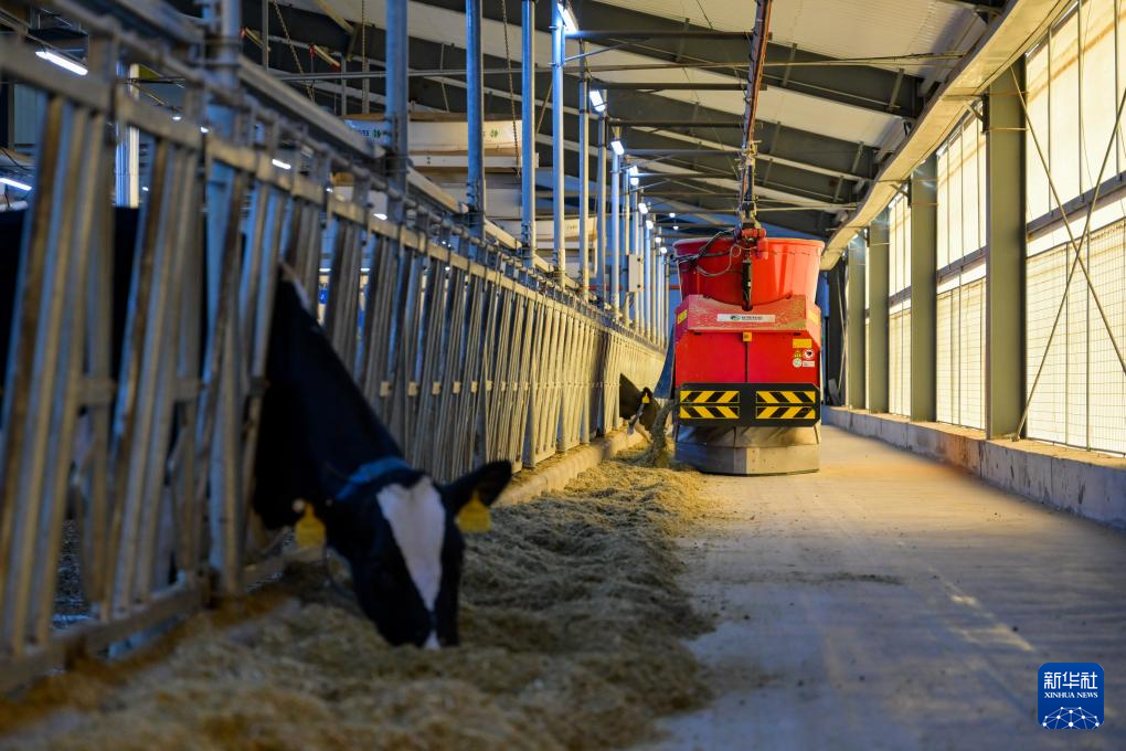 11月23日,在呼和浩特市伊利敕勒川生态智慧牧场,机器人在添加饲料。