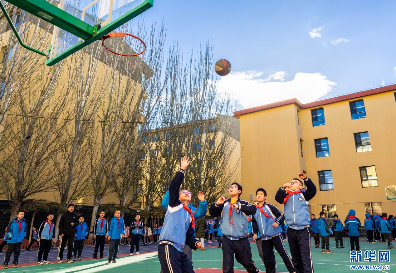 11月27日,呼和浩特市玉泉区清泉街小学学生利用课间时间玩篮球。新华网发(丁根厚 摄)