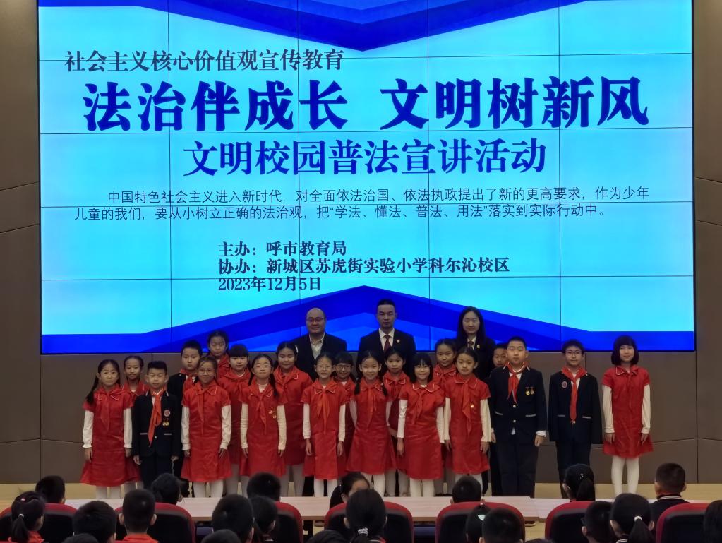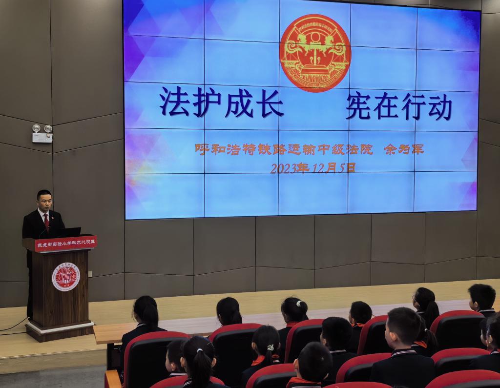 为弘扬宪法精神,坚定法治信仰,增强少年儿童宪法意识和自我保护能力,2023年12月5日,呼和浩特铁路运输中级法院刑事审判庭的干警来到呼和浩特市苏虎街实验小学科尔沁校区开展“宪法宣传进校园”活动。