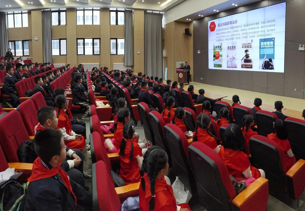 随后,余为军以“法护成长 宪在行动”为主题,讲解了宪法与国家宪法日、未成年保护、预防未成年人犯罪等法律,以及预防校园欺凌、防范毒品、谨防电信网络犯罪等知识,通过一个个鲜活的案例和丰富的内容,教育同学们要学会自我保护、抵制不良行为、预防校园欺凌等,为广大师生献上一堂生动的法治课。讲座中还进行了法律知识互动问答,同学们踊跃举手回答问题,现场气氛热烈,受到师生广泛欢迎。活动的最后,同学们合唱歌曲《宪法伴我成长》,在积极阳光的歌声中,一张张稚嫩的脸庞托起明天的希望。