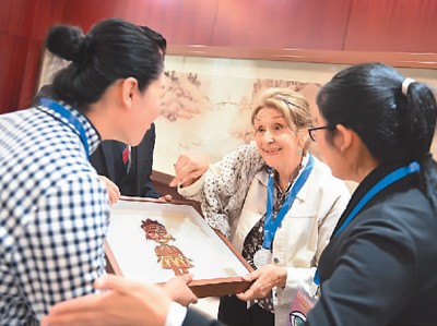 在中非儿童漫画大赛颁奖典礼上,付丽红(左一)将松树艺术画“塞拉姆”赠送给摩洛哥驻华大使夫人(中)。付丽红 供图
