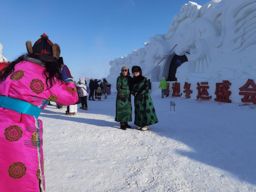 12月17日,在冰雪那达慕开幕式现场游客在拍照留念。