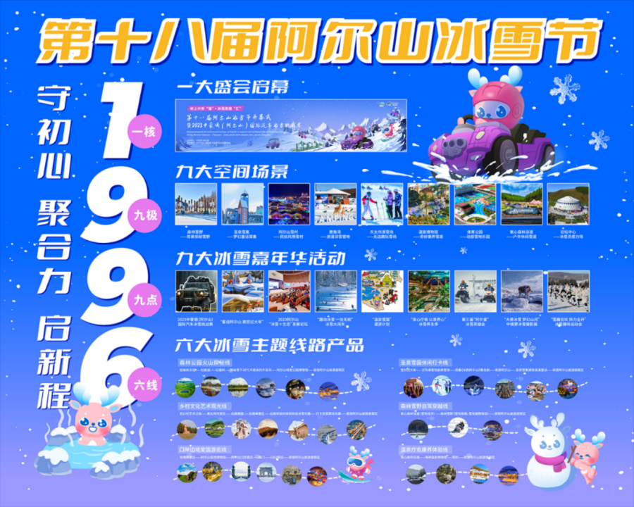 冰雪节开幕暨中蒙俄(阿尔山)国际汽车冰雪挑战赛启动,深雪营地、圣泉雪集、动感雪乐园、康养雪泉等从外场到内景,从荒无到人烟九大空间造梦体验,冰雪运动、年味习俗、摄影论坛、温泉康养、盖章打卡。九大“冰雪+”系列活动从年俗到民俗、从雪野看乡野、从灯火到烟火,六大深度体验路线带你沉浸式体验北方风情。