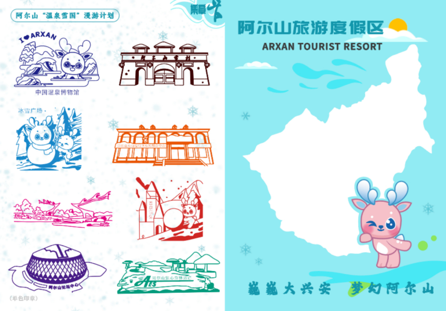 在第十八届阿尔山冰雪节活动期间,阿尔山旅游度假区重磅推出“温泉雪国”漫游计划,“1款套色印章+8款单色印章”带领游客解锁阿尔山旅游度假区各大景点,沉浸式体验温泉雪国漫游,探索阿尔山冰雪旅游新玩法。