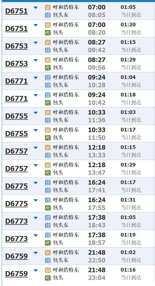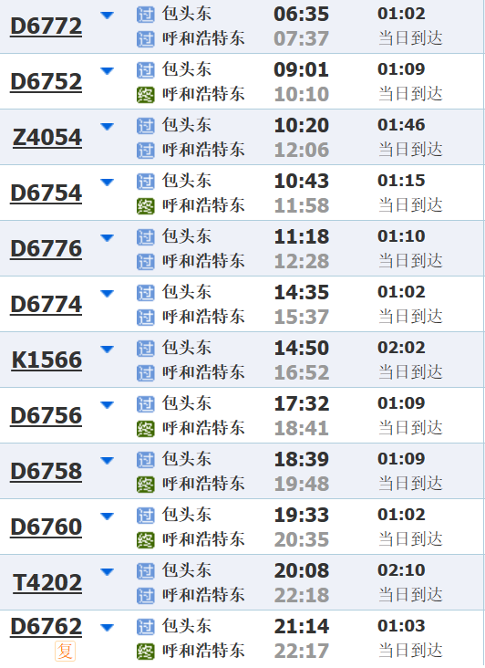 包头⇌呼和浩特部分车次信息
