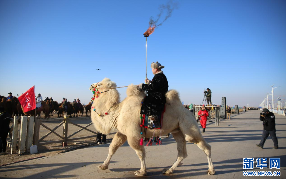 开幕式现场骆驼骑手准备点燃火炬。新华网 杨腾格尔摄